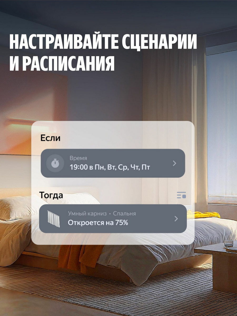 Умный карниз от Яндекса — это устройство, которое помогает управлять шторами в вашем доме. Его можно поставить в гостиной, спальне или детской, чтобы создать комфортную атмосферу для сна и мягкого пробуждения. Карниз имеет телескопическую конструкцию, поэтому он подойдёт для окон разной ширины — от 180 сантиметров до трёх метров.